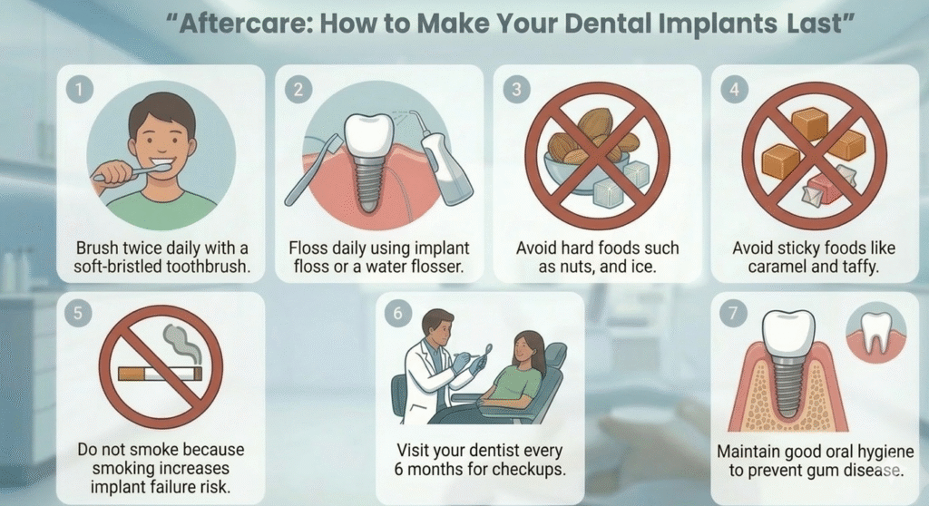 Your dental implants can last 20-30+ years with proper care. Here’s how to protect your investment: